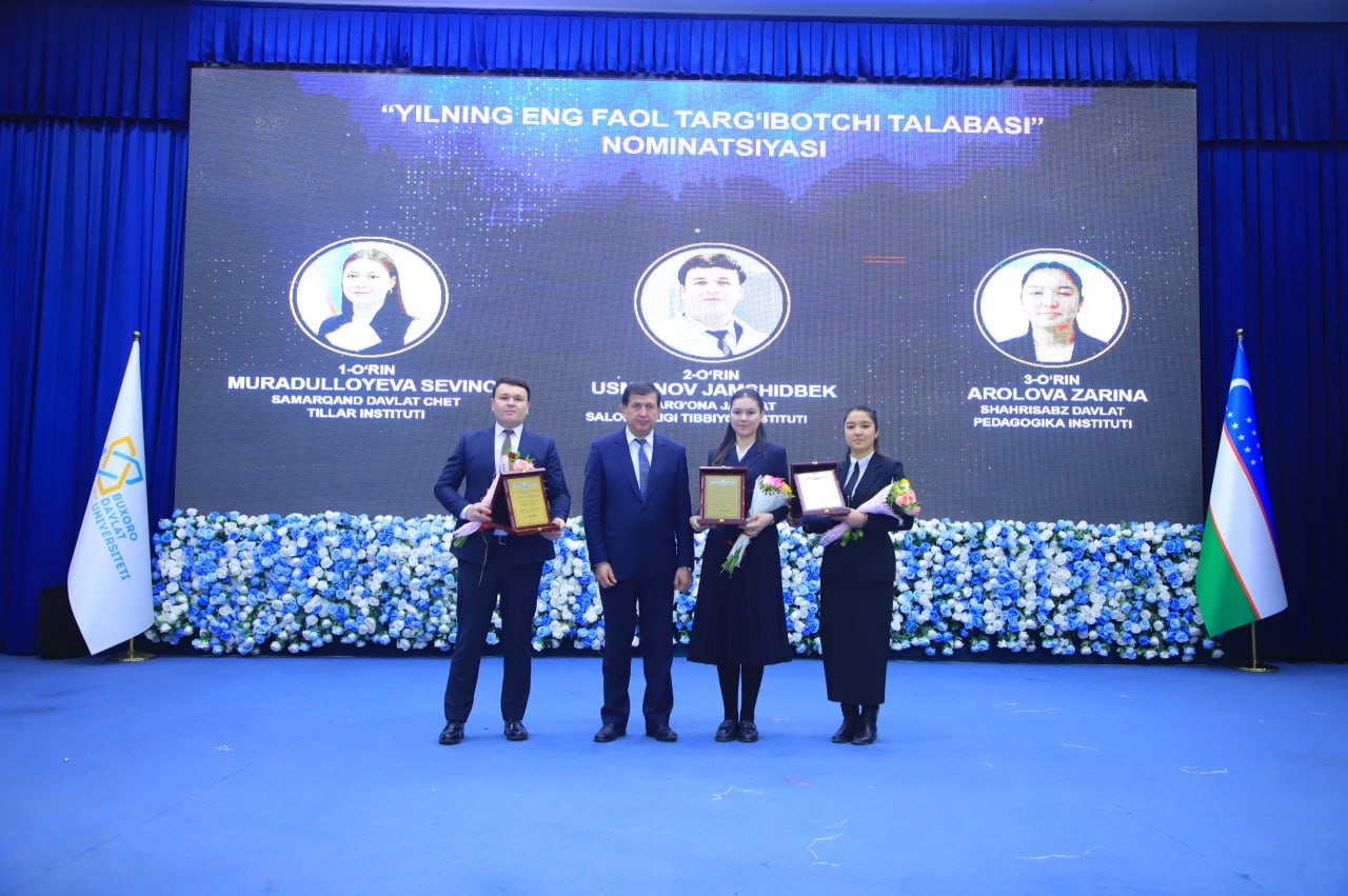 Shuningdek, “Eng faol milliy g‘oya va ma’naviyat targ‘ibotchisi” respublika tanlovida 2-o‘rin sohibasi — Feruza Toirova, “Eng yaxshi tyutor” tanlovida 3-o‘rin sohibasi — Saidahon Xodjayeva e’tirof etildi. Bundan tashqari, stomatologiya fakultetining uchinchi kurs talabalari jamoasi “Mening O‘zbekistonim” videoroliklar tanlovida 3-o‘rinni qo‘lga kiritdi.