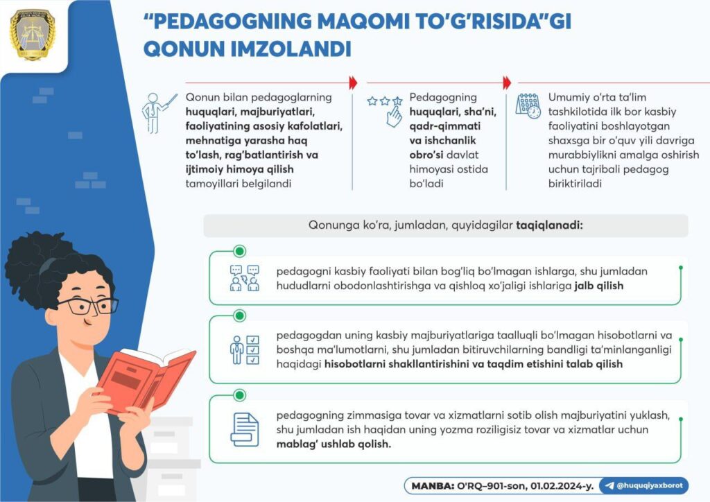 O‘zbekiston Respublikasining 2024-yil 1-fevraldagi “Pedagogning maqomi to‘g‘risida” O‘RQ-901-son Qonuni 19-moddasida O‘zbekiston Respublikasi Oliy ta’lim, fan va innovatsiyalar vazirligiga ushbu Qonunning ijrosini, ijrochilarga yetkazilishini hamda mohiyati va ahamiyati aholi o‘rtasida tushuntirilishini ta’minlash vazifasi yuklatilganliginini ma’lumot uchun qabul qiladi.Mazkur topshiriq ijrosini ta’mish maqsadida Buxoro davlat tibbiyot institutida O‘zbekiston Respublikasining “Pedagogning maqomi to‘g‘risida” Qonunining mazmun mohiyatini tushuntirish ishlari olib borildi. O’quv seminarida 40 dan ortiq professor-o’qituvchilar ishtirok etishdi. Qonun bilan pedagoglarning huquqlari, majburiyatlari, faoliyatining asosiy kafolatlari, mehnatiga yarasha haq to’lash, rag’batlantirish va ijtimoiy himoya qilish tamoyillari ,pedagogning huquqlari, sha’ni, qadr-qimmati va ishchanlik obro’si davlat himoyasi ostida bo’lishi, pedagogning zimmasiga tovar va xizmatlarni sotib olish majburiyatini yuklash, shu jumladan ish haqidan uning yozma roziligisiz tovar va xizmatlar uchun mablag’ ushlab qolish qat’iyan man qilinganligi bilan bog’liq masalalar to’grisida ta’kidlab o’tildi.