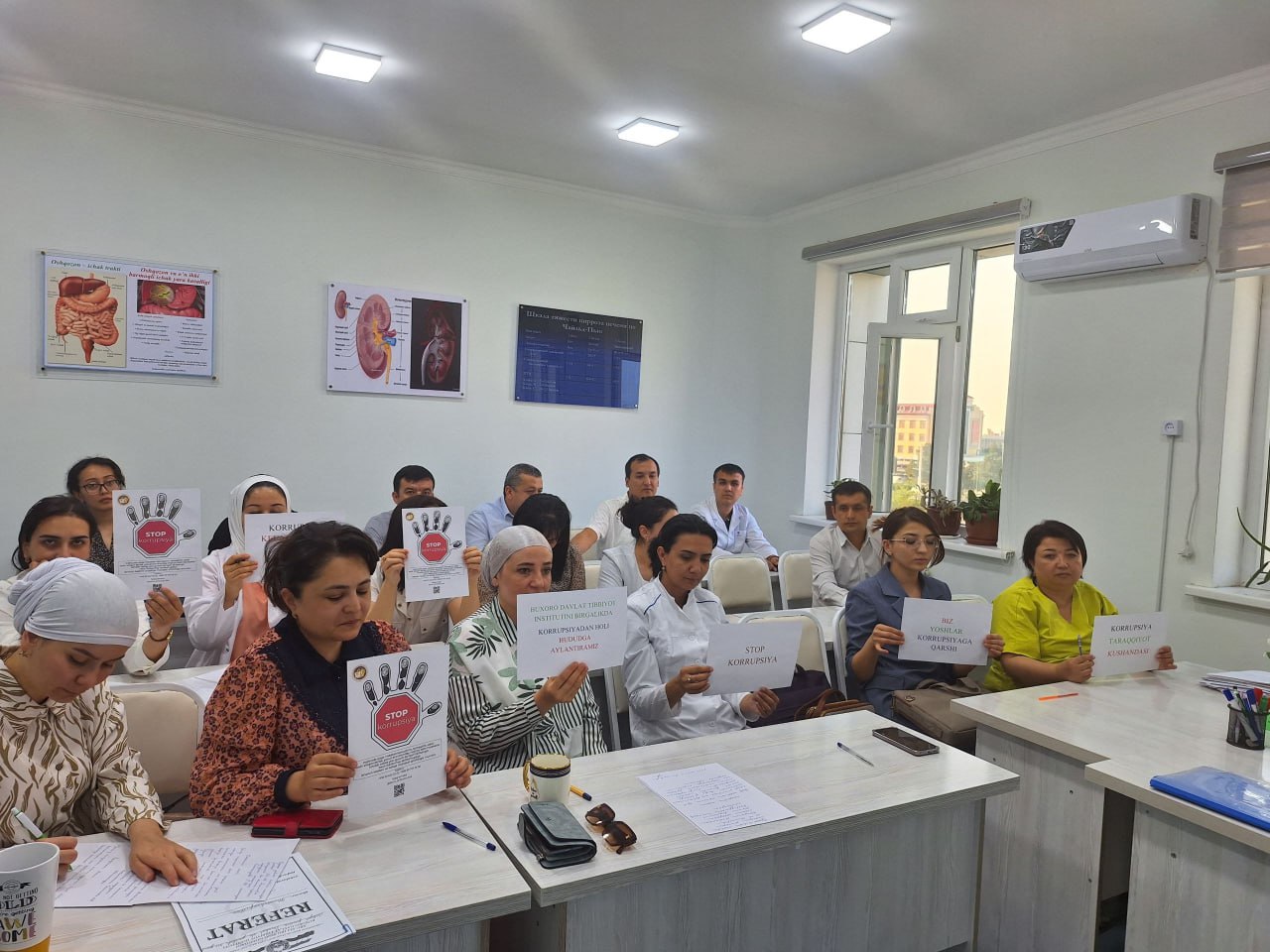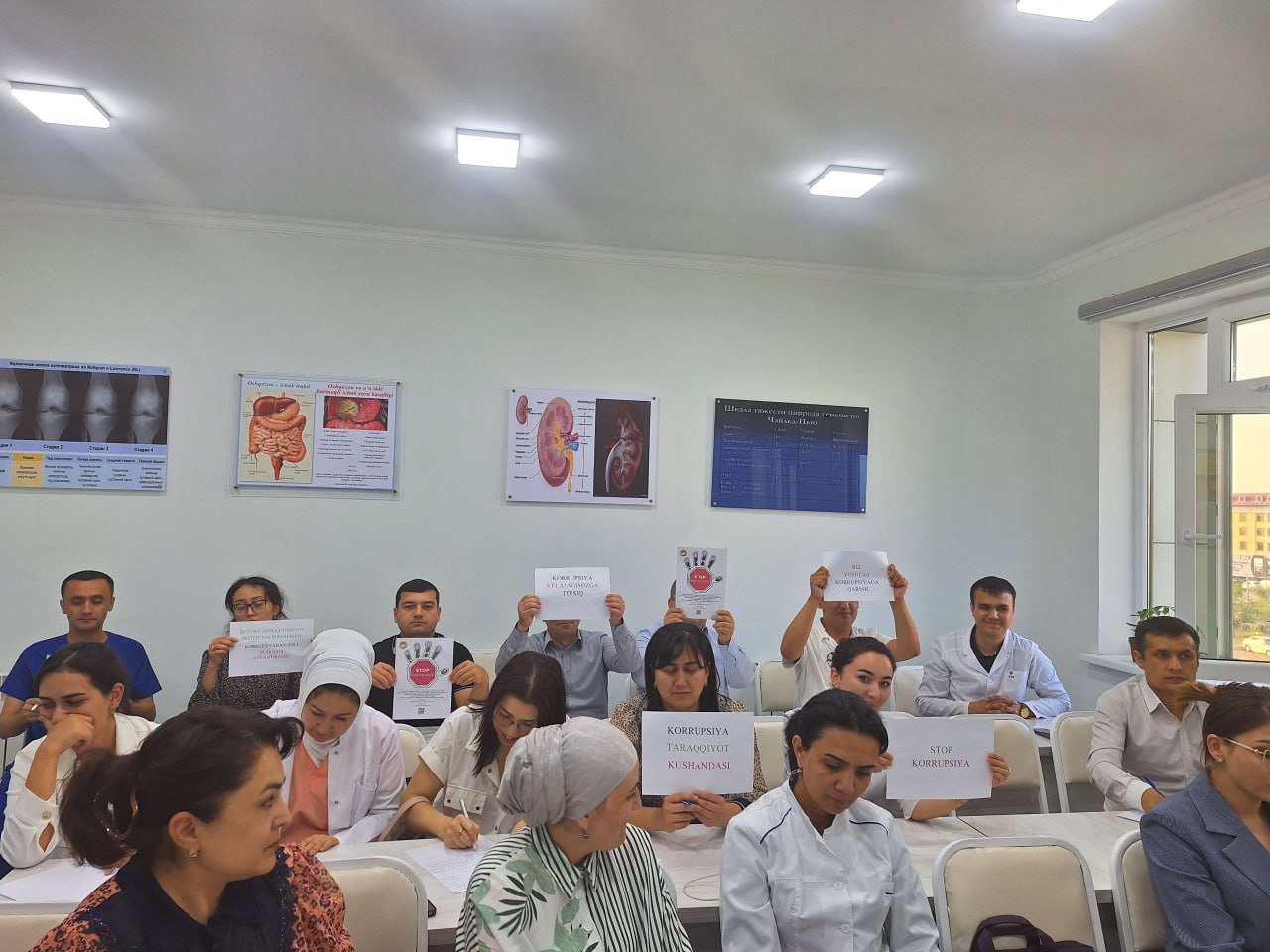 On April 14 of this year, a preventive event on the topic “Education Without Corruption” was held among the faculty members of the “Elective and Hospital Therapy” Department of the Medical Faculty at Bukhara State Medical Institute. The event was organized with the participation of X.B. Fayziyev, Head of the “Compliance Control” Department for Anti-Corruption Management, O.A. Rajabov, the department’s leading specialist, and S.S. Davlatov, Head of the Department for Quality Control of Education.