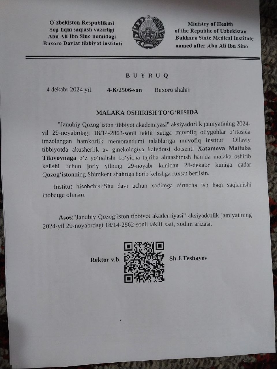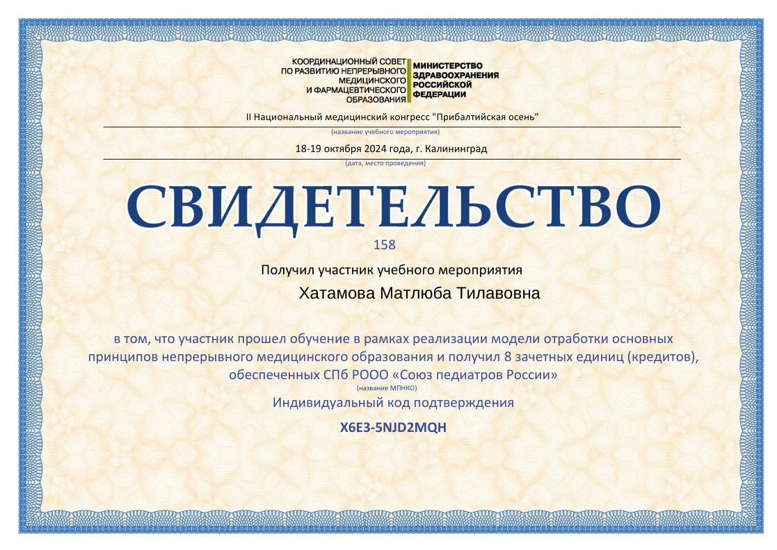 - Ахмедов Ф.К., З.Ш. Курбонова. Мочевая кислота- маркер развития преэклапсия// Новости дерматологии и репродуктивного здоровья – Ташкент, 2017. – №3-4(II) – С. 27-29. (14.00.00. №14).