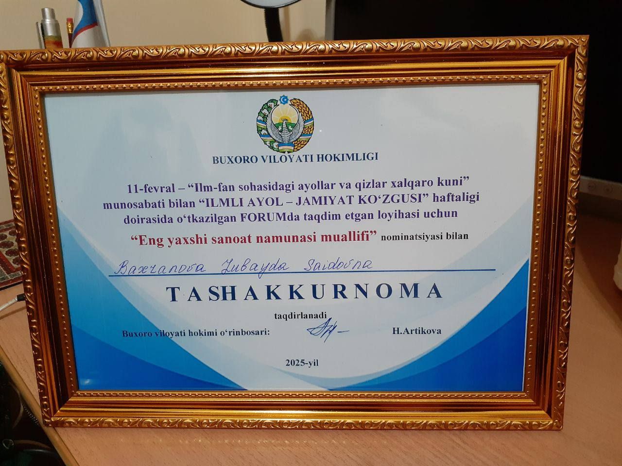 🏛 В рамках форума первому проректору по делам молодежи, духовно-просветительской работы Бухарского государственного медицинского института З.С. Бахрановой было вручено Благодарственное письмо от хокимията Бухарской области за ее широкомасштабную деятельность в рамках недели “Образованная женщина – зеркало общества”, приуроченной к Международному дню женщин и девочек в науке.